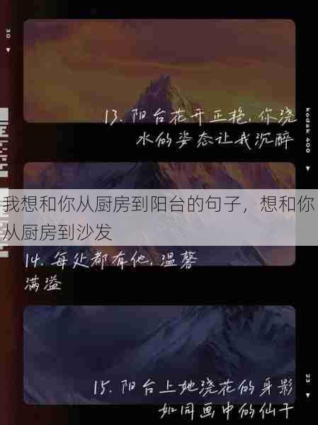 “我想和你从厨房到阳台的句子”是对生活方式、家庭关系以及个人需求深刻洞察的体现。它不仅仅是对物理空间的描绘,更是对人类情感和心理需求的探索。从厨房的忙碌到阳台的宁静,我们在生活中追求的是亲密与独立之间的平衡,是责任与自由之间的过渡。